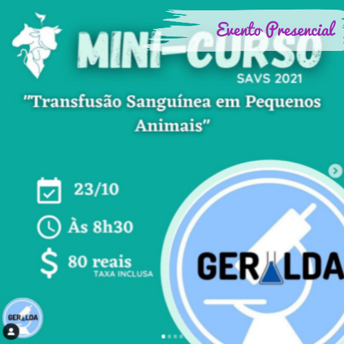 Universidade de Sorocaba - Cidade Universitária Prof. Aldo Vannucchi Rod. Raposo Tavares, km 92,5 - Vila Artura, Sorocaba - SP, 18023-000, Sorocaba, SP, BrasilDa série: Mini-curso da SAVS… Vem aí…“Transfusão Sanguínea em Pequenos Animais” por @geraldauniso. Ministrado pela M.V. Beatriz Antunes Silva. O mini-curso acontecerá de forma presencial no Casarão HVU na Cidade Universitária no dia 23/10, às 08h30.
