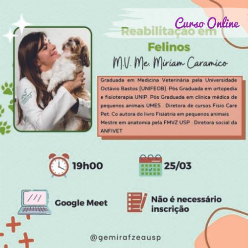 Nossa segunda palestra será no dia 25/03, às 19h, e será ministrada pela M.V. Me. Miriam Caramico com o título “Reabilitação em Felinos”.