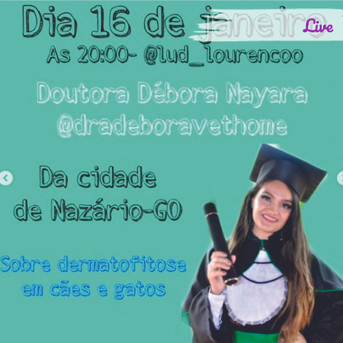 A live do dia 16/01, às 20h terá como tema: “Dermatofitose em cães e gatos”, com a médica veterinária Débora Nayara.