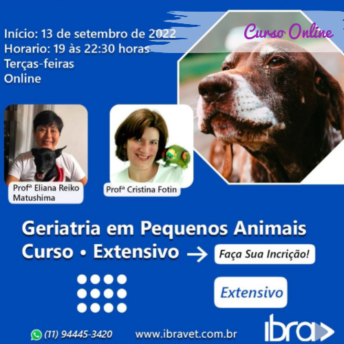 Extensivo – Geriatria em Pequenos Animais. Início: 13 de setembro de 2022. Horário: 19h às 22h30 (Terças-feiras). Carga Horária Total: 70 horas.